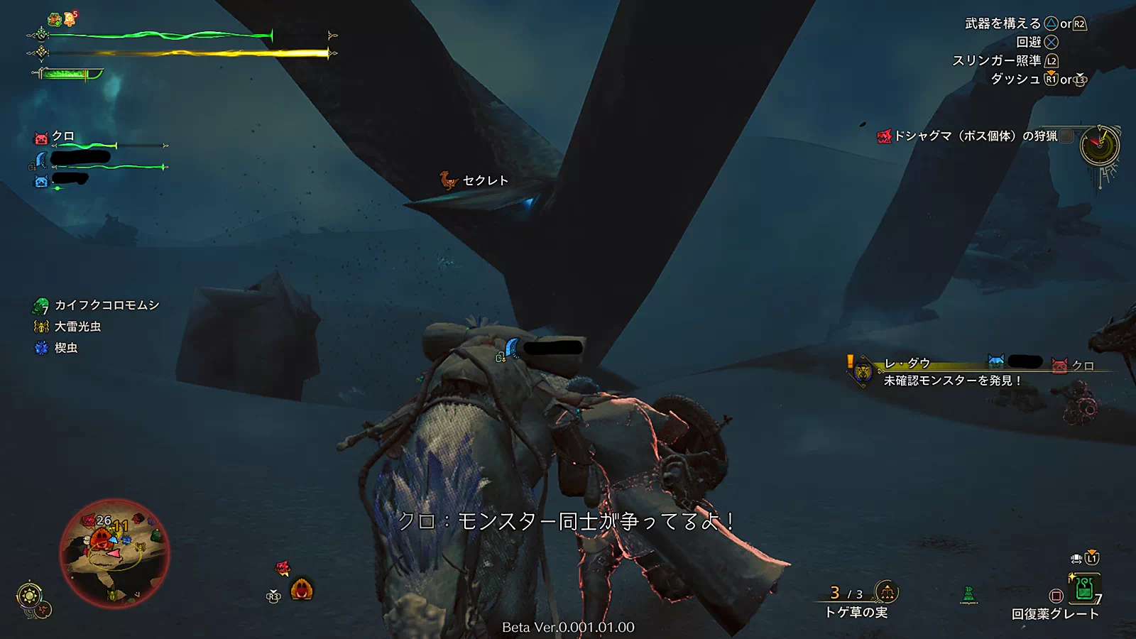 ひとりでも大型モンスターがわちゃわちゃし始めたり、砂嵐の天候になるとFPSが25前後まで落ちて、かなりカクつきが目立ちました。